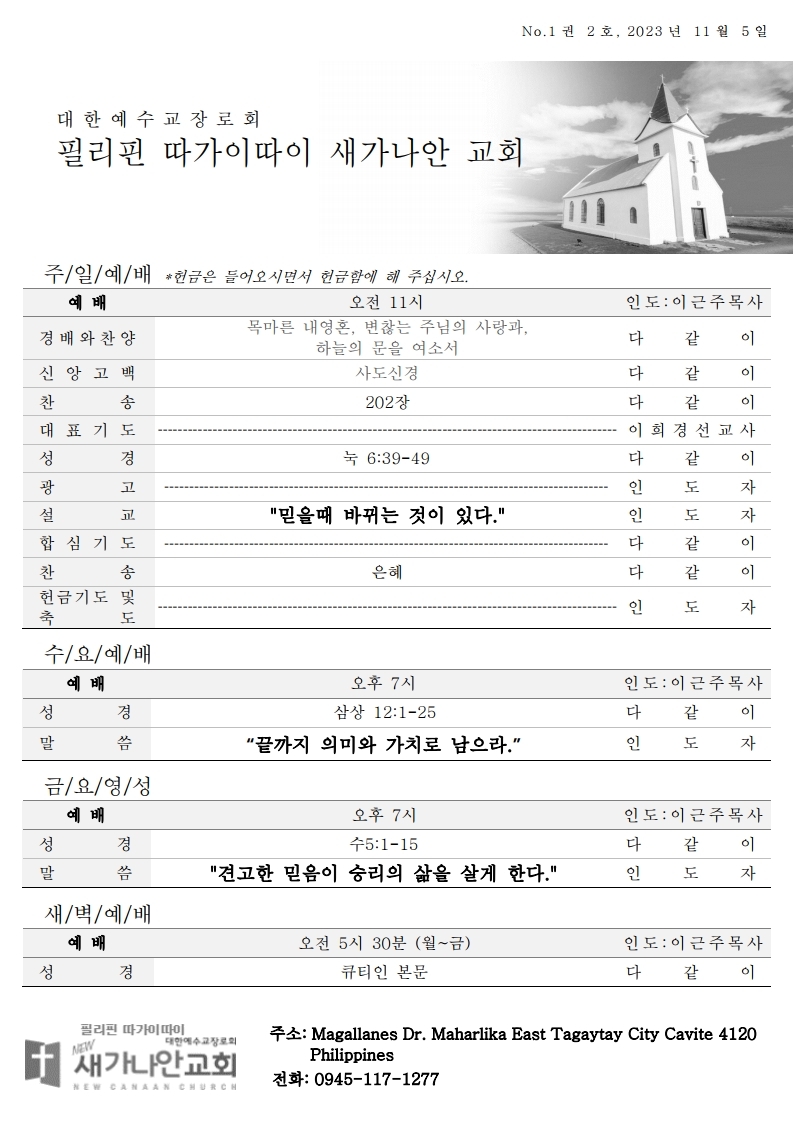 2023.11.5 주보 페이지 정보 작성자관리자 댓글 0건 조회 972회 작성일 23-11-11 19:20 본문 SNS 공유 첨부파일 필리핀 새가나안 주보_Nov5,2023.pdf (422.6K) 0회 다운로드 | DATE : 2023-11-11 19:20:50 목록 이전글2023.11.12 주보 23.11.11 다음글2023.10.29 주보 23.10.31 댓글목록 댓글목록 등록된 댓글이 없습니다.